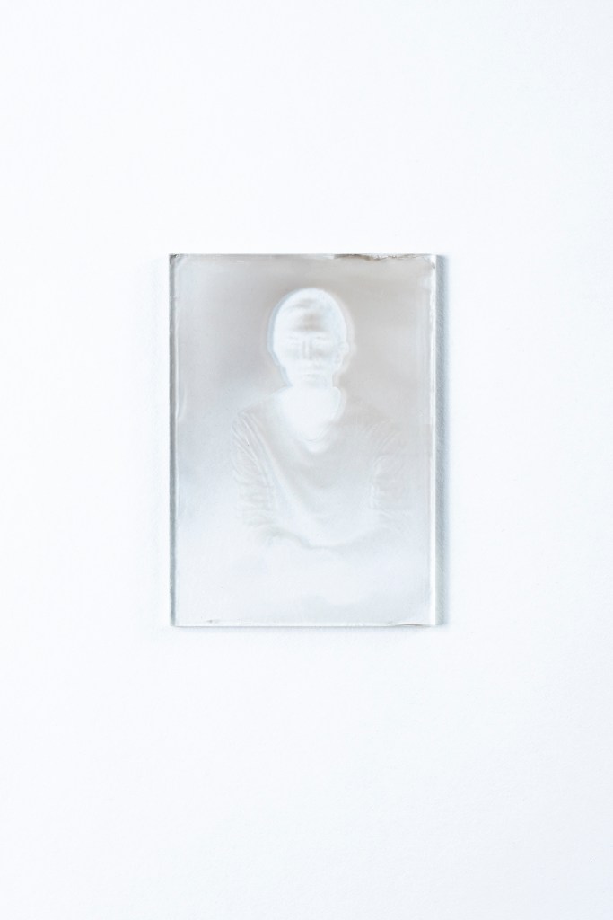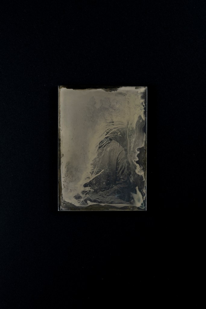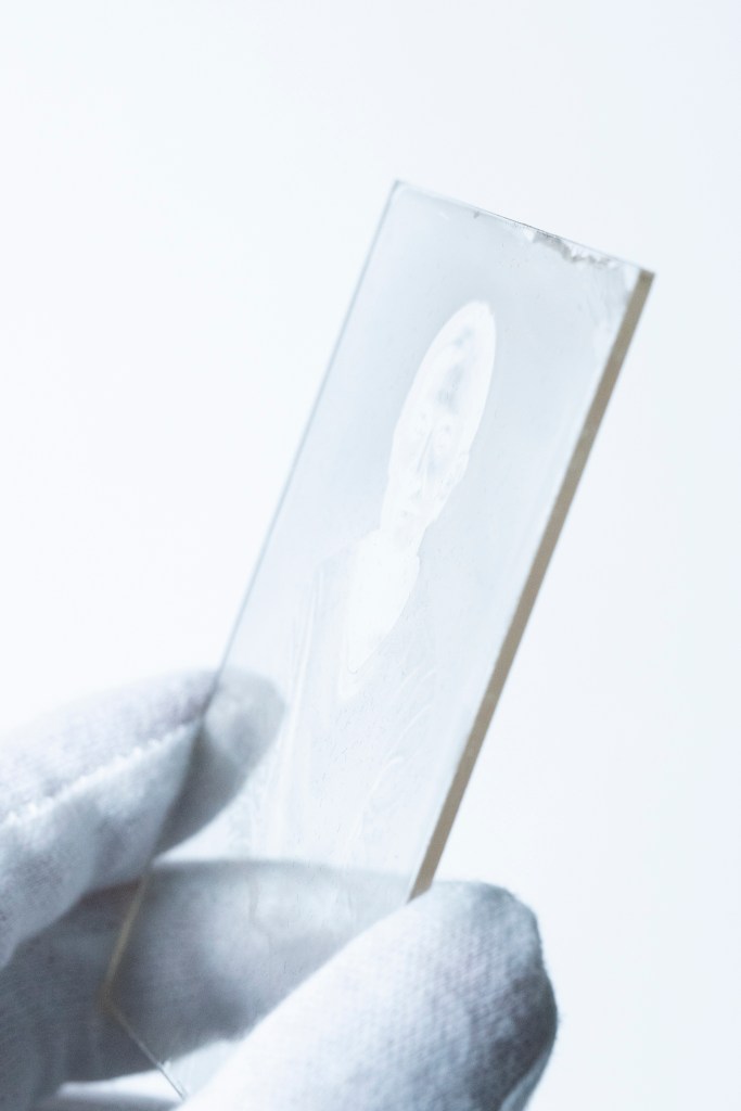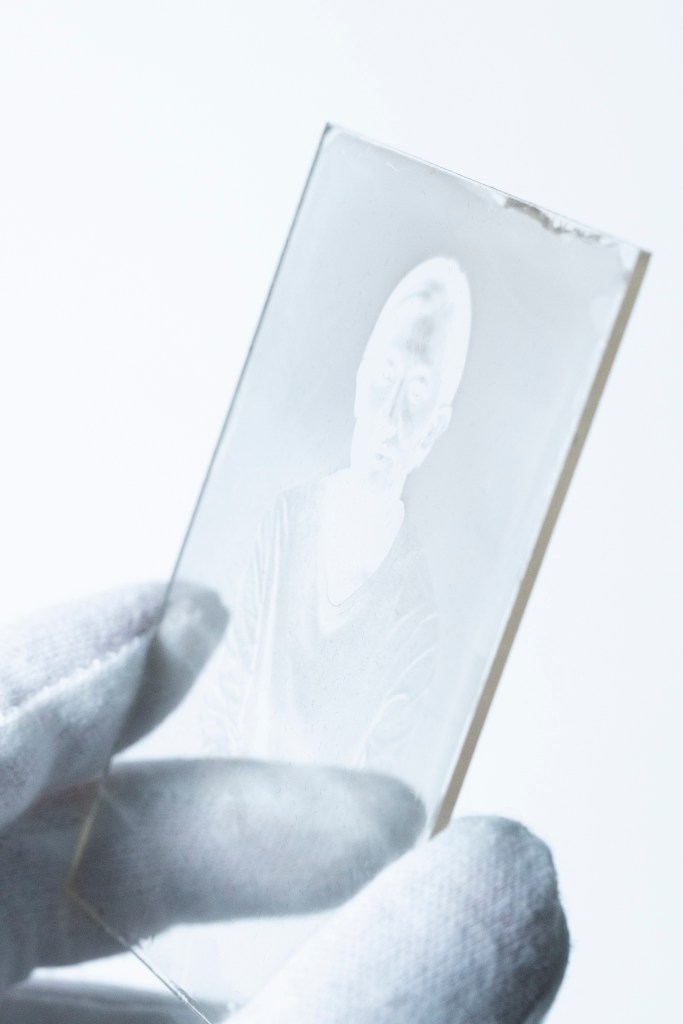 湿板写真でセルフポートレートを撮影した。ガラスを研磨するところから始めて、溶液の製作、撮影、現像、定着、洗浄、全てのプロセスを一つの小さな部屋で行なった。像を写した硝子板は、その撮像プロセスを再現内包しているような厚みを持つ。